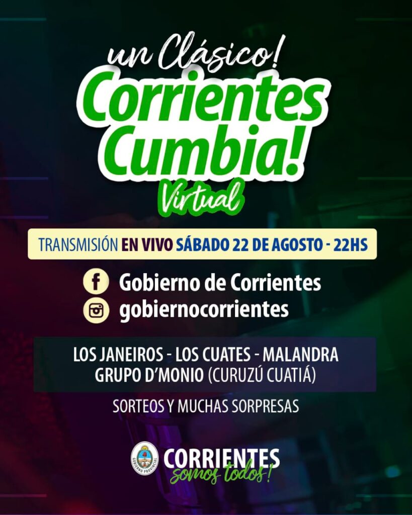 La propuesta musical del “Corrientes Cumbia” como siempre será transmitido desde las 22 hs por Canal 13 MAX y las redes oficiales del Gobierno Facebook: Gobierno de Corrientes, e Instagram: @gobiernodecorrientes. En la oportunidad, además de los sorteos y sorpresas preparadas para esta noche, actuarán: LOS JANEIROS, LOS CUATES, MALANDRA y desde Curuzú Cuatiá estará el Grupo D´MONIO.