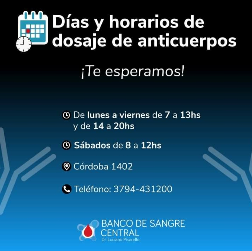 El Banco de Sangre Central de Corrientes comparte con la comunidad los horarios para realizarse el dosaje de anticuerpos para poder donar plasma convaleciente. Una vez que estén los resultados, la entidad se comunica con los voluntarios para coordinar el procedimiento.