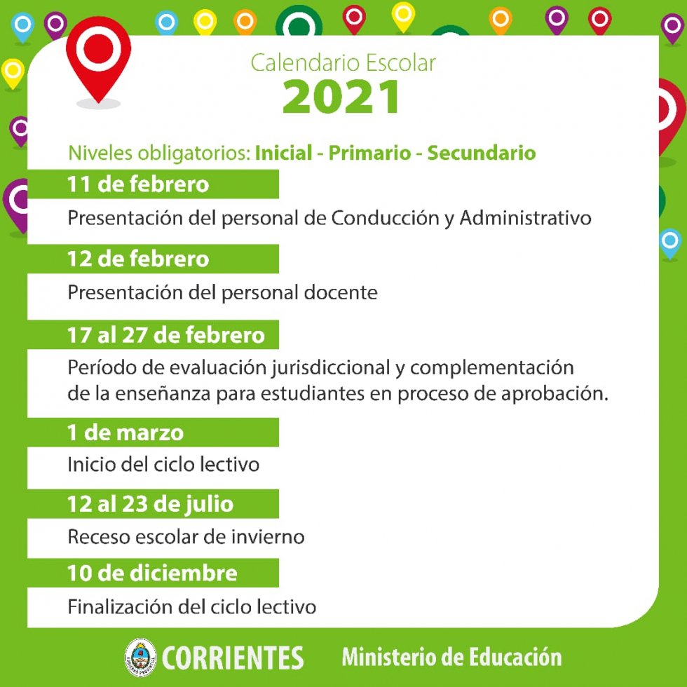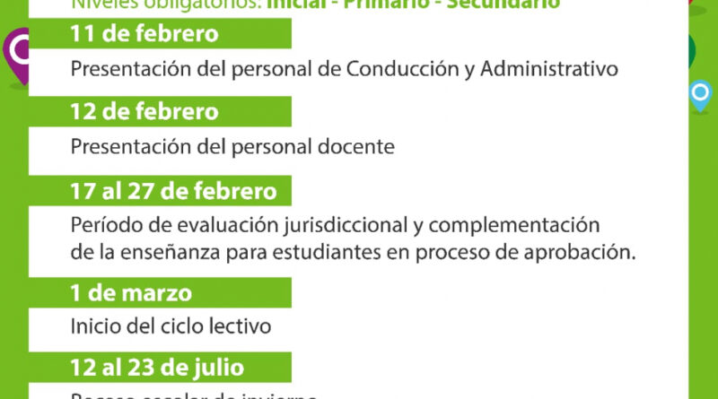 Teniendo como el 01 de marzo el comienzo del ciclo lectivo, con receso invernal del 12 al 23 de julio y finalmente el 10 de diciembre del corriente año culminaría el dictado de clases.