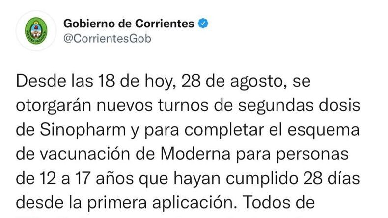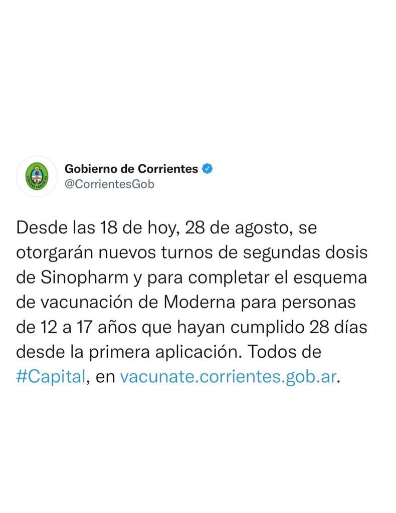 El Gobierno de Corrientes anunció que desde las 18 de hoy -sábado 28- se otorgarán turnos de vacunación contra el Covid-19 en Capital. Específicamente, para la aplicación de segundas dosis de Sinopharm y para completar el esquema de vacunación de Moderna para personas de 12 a 17 años que hayan cumplido al menos 28 días desde la primera inoculación.Será a través de la web vacunate.corrientes.gob.ar.