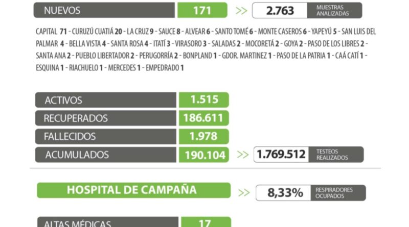 El informe epidemiológico de la provincia de Corrientes registró este viernes 171 nuevos casos positivos de Coronavirus, de los cuales 71 fueron contagios en la ciudad Capital y los 100 restantes en 27 localidades del interior provincial, al haberse analizado 2.763 muestras en las últimas 24 horas.