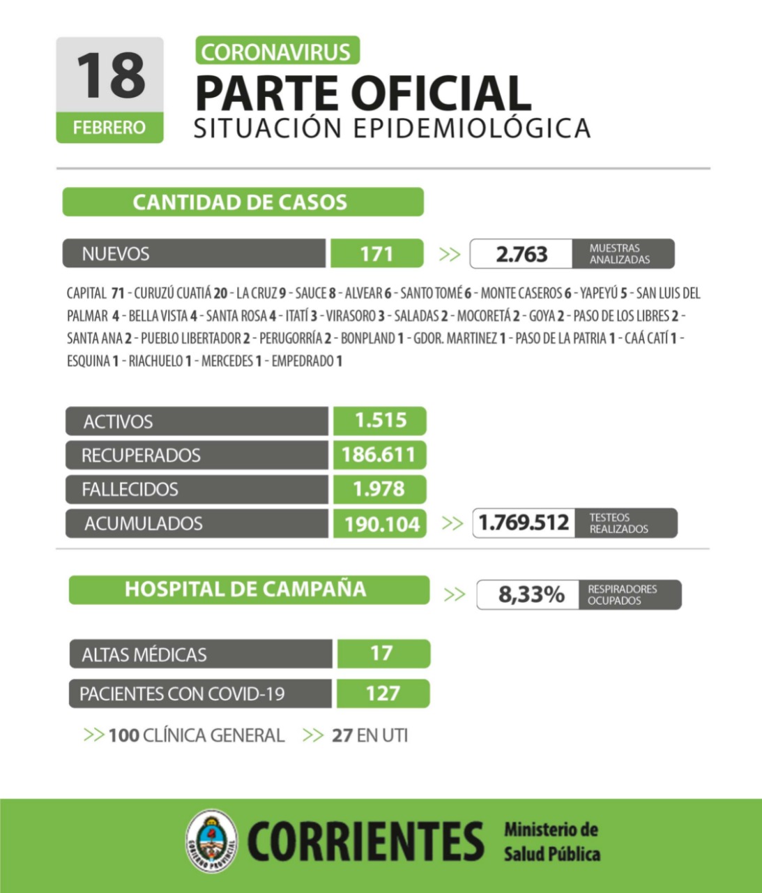 Los nuevos casos son: Capital 71, Curuzú Cuatiá 20, La Cruz 9, Sauce 8, Alvear 6, Santo Tomé 6, Monte Caseros 6, Yapeyú 5, San Luis del Palmar 4, Bella Vista 4, Santa Rosa 4, Itatí 3, Virasoro 3, Saladas 2, Mocoretá 2, Goya 2, Paso de los Libres 2, Santa Ana 2, Pueblo Libertador 2, Perugorria 2, Bonpland 1, Gobernador Martínez 1, Paso de la Patria 1, Caá Catí 1, Esquina 1, Riachuelo 1, Mercedes 1, Empedrado 1.