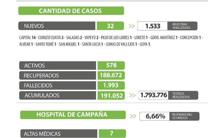 Los nuevos casos son: Capital 14, Curuzú Cuatiá 3, Saladas 2, Yapeyú 2, Paso de los Libres 1, Concepción 1, Loreto 1, Gobernador Martínez 1, Alvear 1, Santo Tomé 1, San Miguel 1, Santa Lucía 1, Lomas de Vallejos 1 y Goya 1.