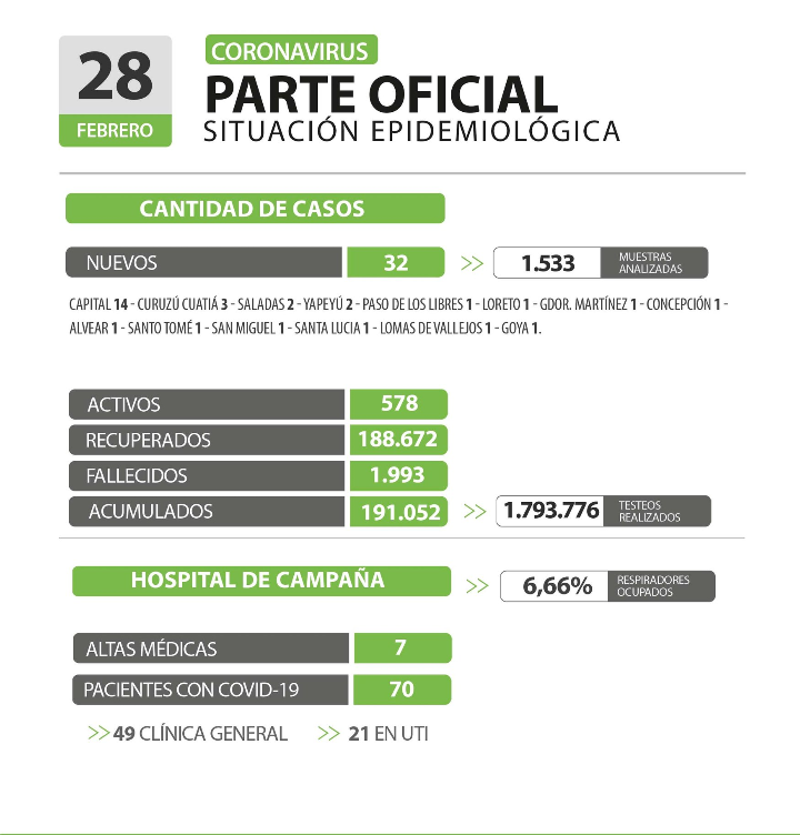Esto actualiza la cifra de casos activos en 578 y los acumulados en 191.052 en todo el territorio provincial al 28 de febrero de 2022, con 1.793.776 testeos realizados desde que inició la pandemia y 188.672 recuperados.