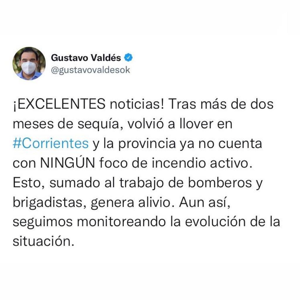 El gobernador Gustavo Valdés, mediante su cuenta de Twitter (gustavovaldesok), esta tarde anunció que “tras más de dos meses de sequía, volvió a llover en Corrientes y la provincia ya no cuenta con ningún foco de incendio activo”.