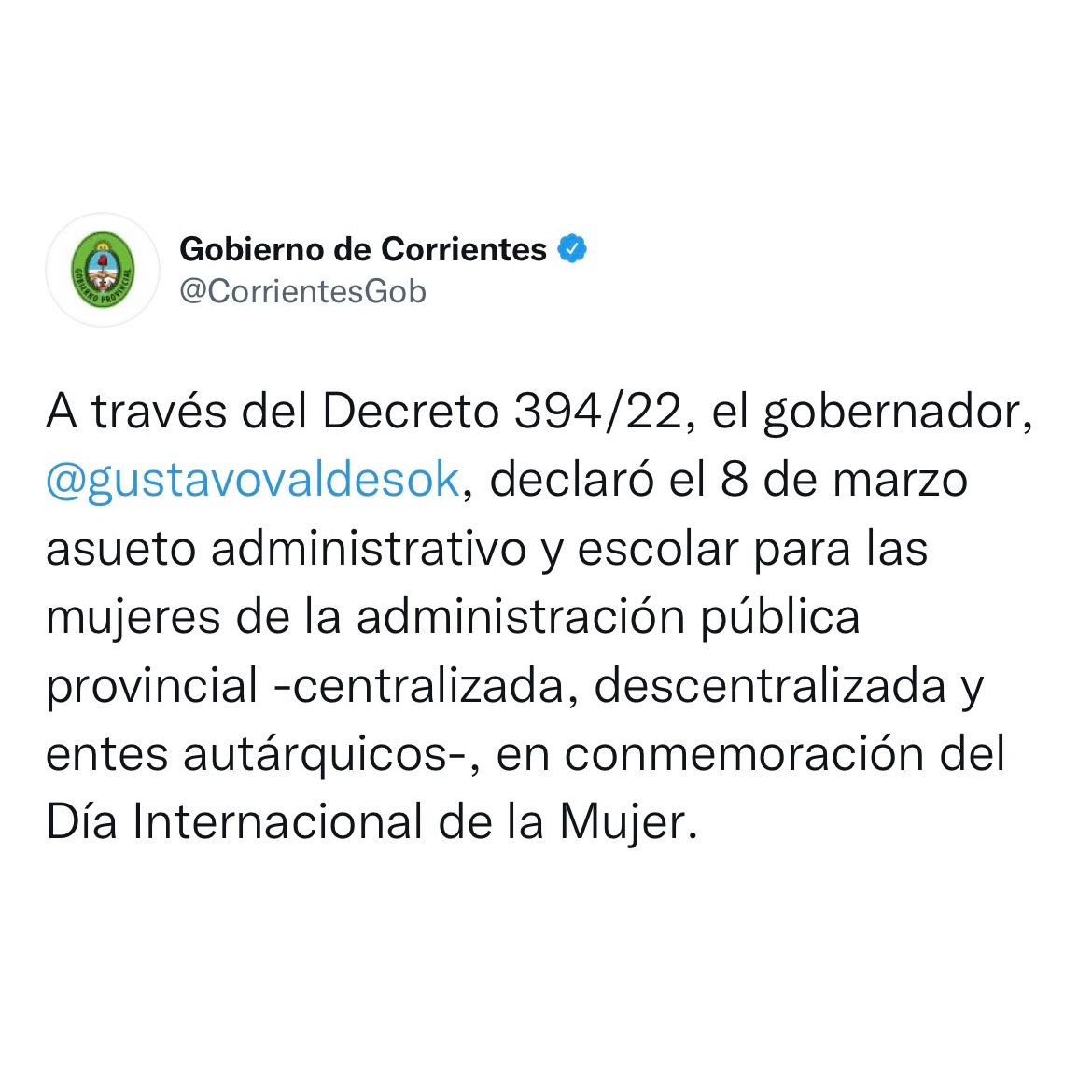 A través del Decreto 394/22, el gobernador, Gustavo Valdés, declaró el 8 de marzo asueto administrativo y escolar para las mujeres de la administración pública provincial -centralizada, descentralizada y entes autárquicos-, en conmemoración del Día Internacional de la Mujer.