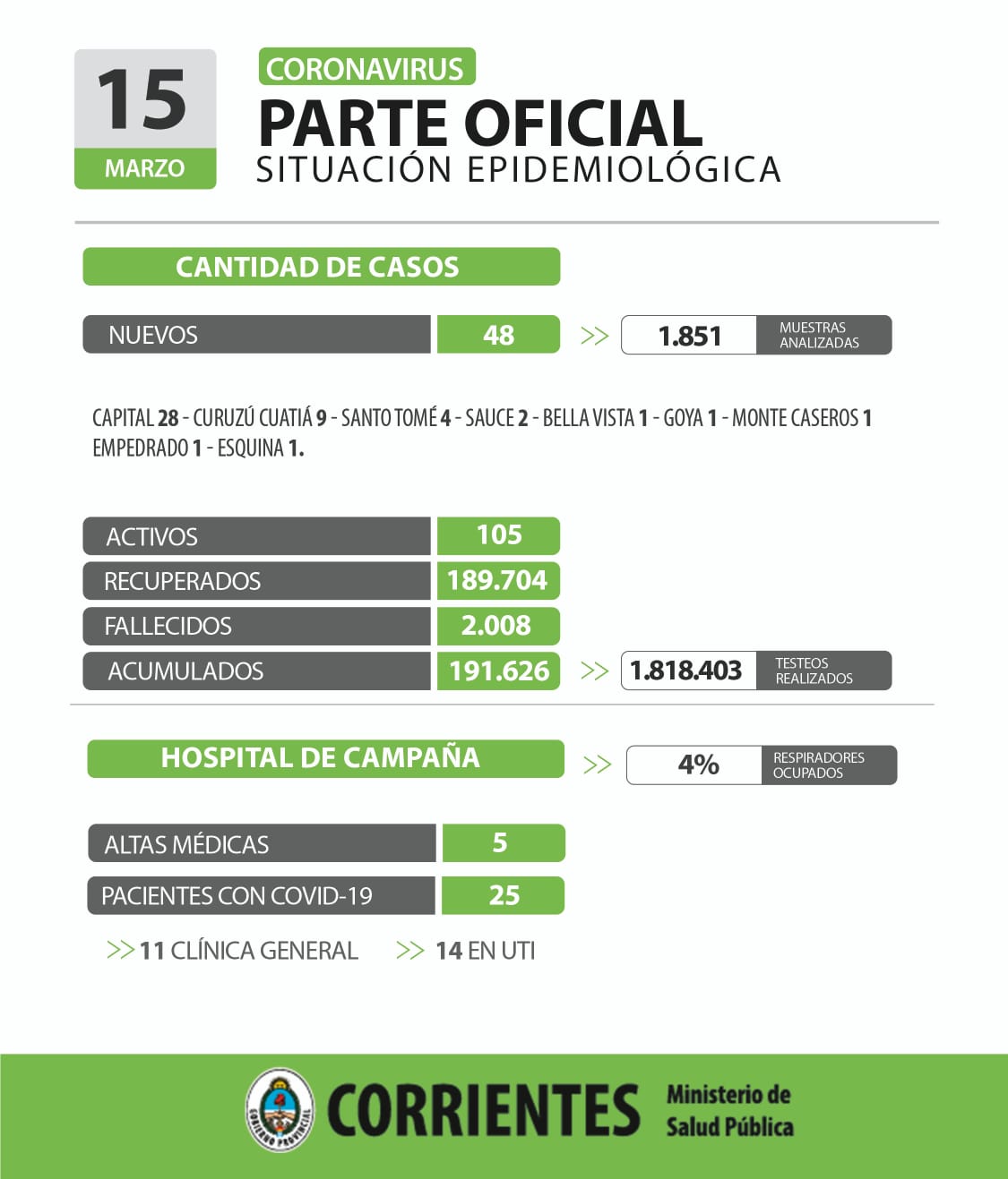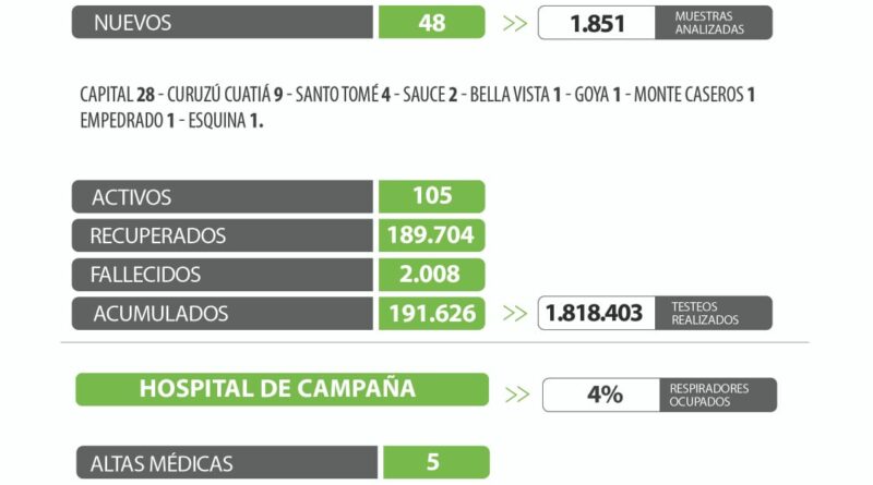 El informe epidemiológico de la provincia de Corrientes registró este martes 48 nuevos casos positivos de Coronavirus, de los cuales 28 fueron contagios en la ciudad Capital y los 20 restantes en 8 localidades del interior provincial, al haberse analizado 1.851 muestras en las últimas 24 horas.