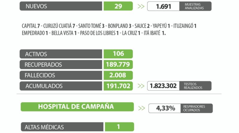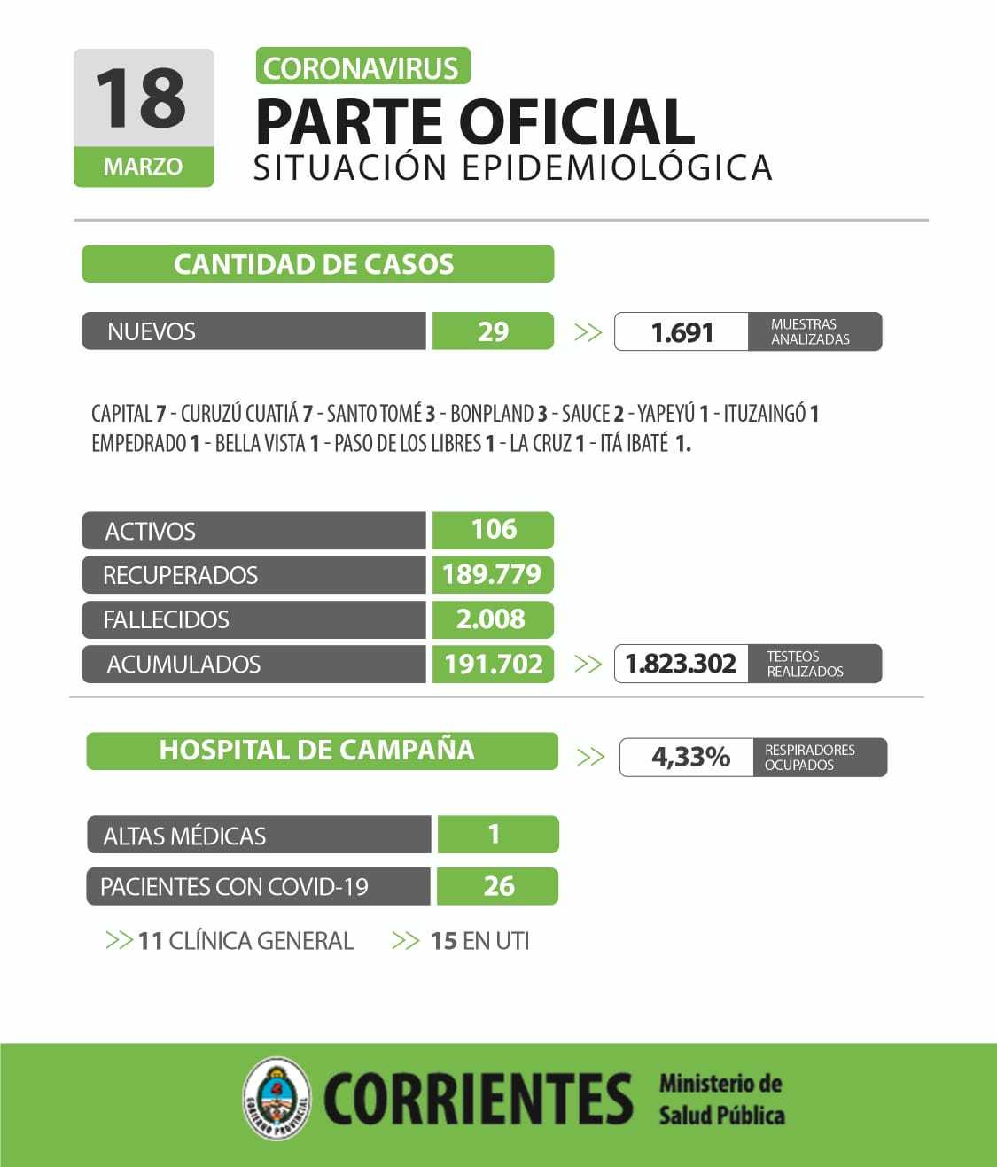 El informe epidemiológico de la provincia de Corrientes registró este viernes 29 nuevos casos positivos de Coronavirus, de los cuales 7 fueron contagios en la ciudad Capital y los 22 restantes en 11 localidades del interior provincial, al haberse analizado 1691 muestras en las últimas 24 horas.