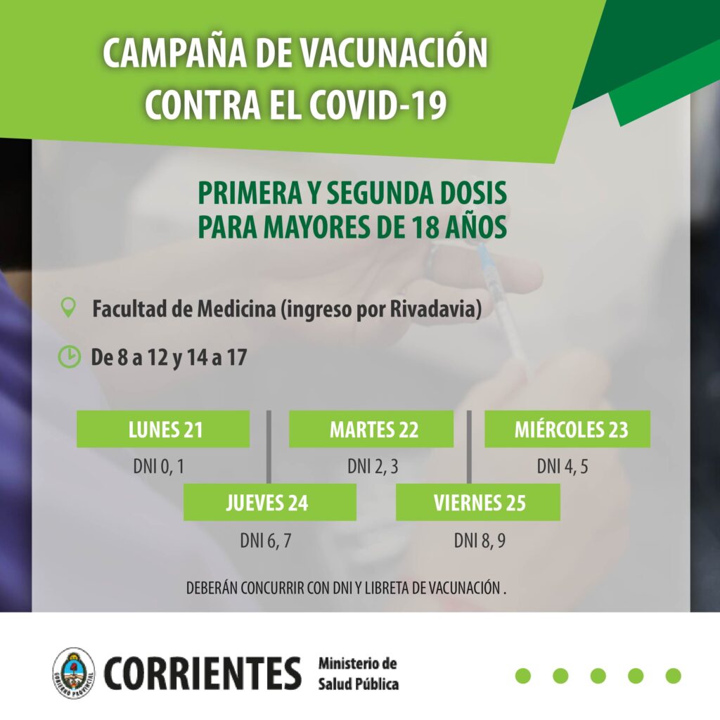 El Ministerio de Salud Pública a través de la Dirección de Inmunizaciones, continúa con la campaña de vacunación contra el Covid-19. Desde el lunes hasta el viernes iniciarán, completarán y reforzarán esquemas. Será por terminación de DNI en los lugares designados según grupo etario.
