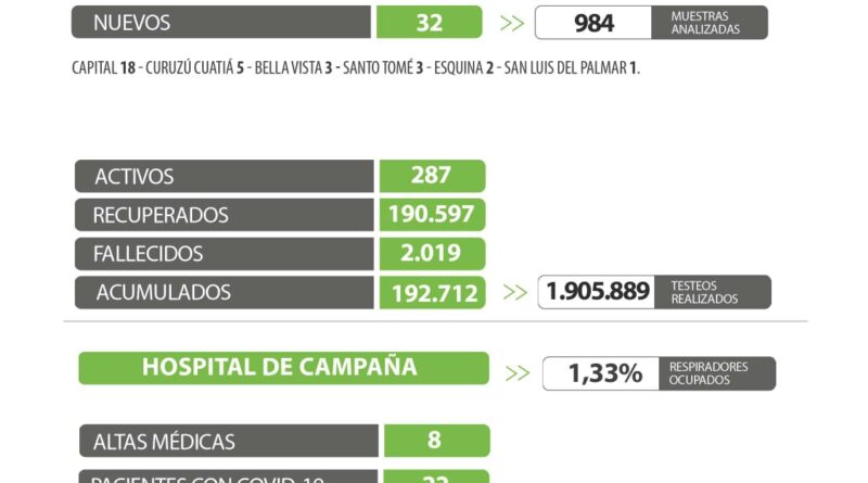 Los nuevos casos son: Capital 18 – Curuzú Cuatiá 5 – Bella Vista 3 – Santo Tomé 3 – Esquina 2 – San Luis del Palmar 1.