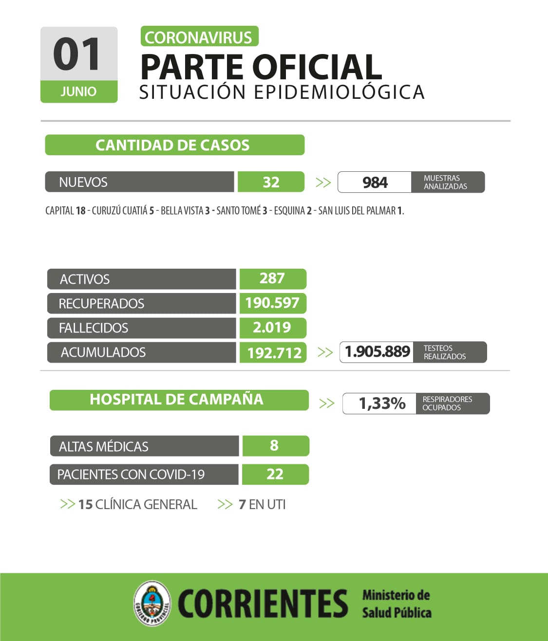 El informe epidemiológico de la provincia de Corrientes registró este miércoles, 32 nuevos casos positivos de Coronavirus, de los cuales 18 fueron contagios en la ciudad Capital y los 14 restantes en 5 localidades del interior provincial, al haberse analizado 984 muestras en las últimas 24 horas.