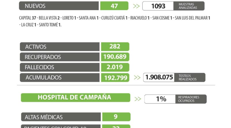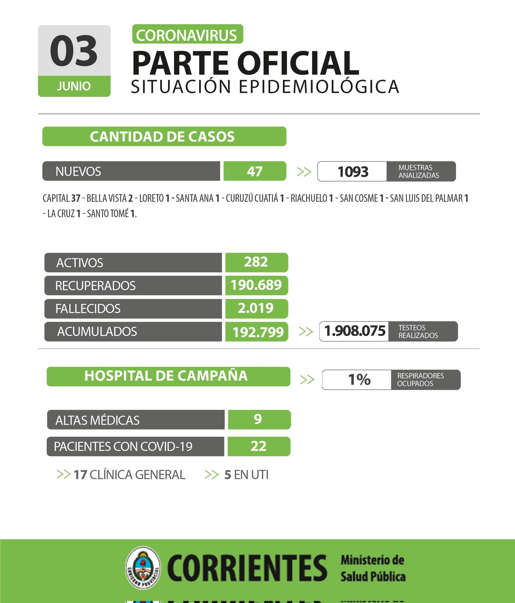 El informe epidemiológico de la provincia de Corrientes registró este viernes 47 nuevos casos positivos de Coronavirus, de los cuales 37 fueron contagios en la ciudad Capital y los 10 restantes en 9 localidades del interior provincial, al haberse analizado 1093 muestras en las últimas 24 horas.