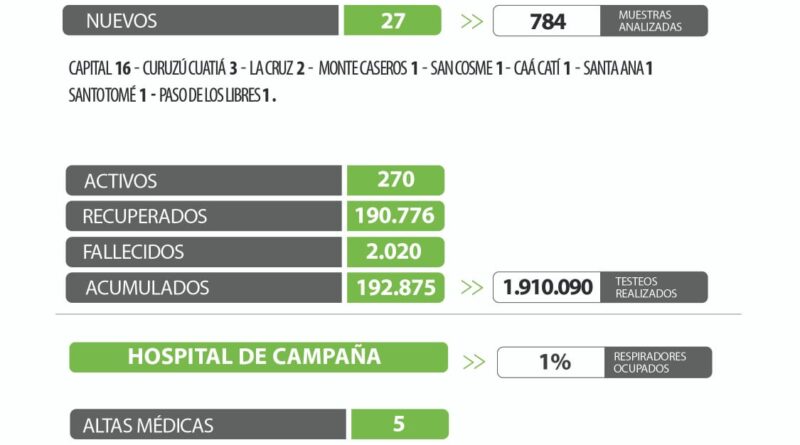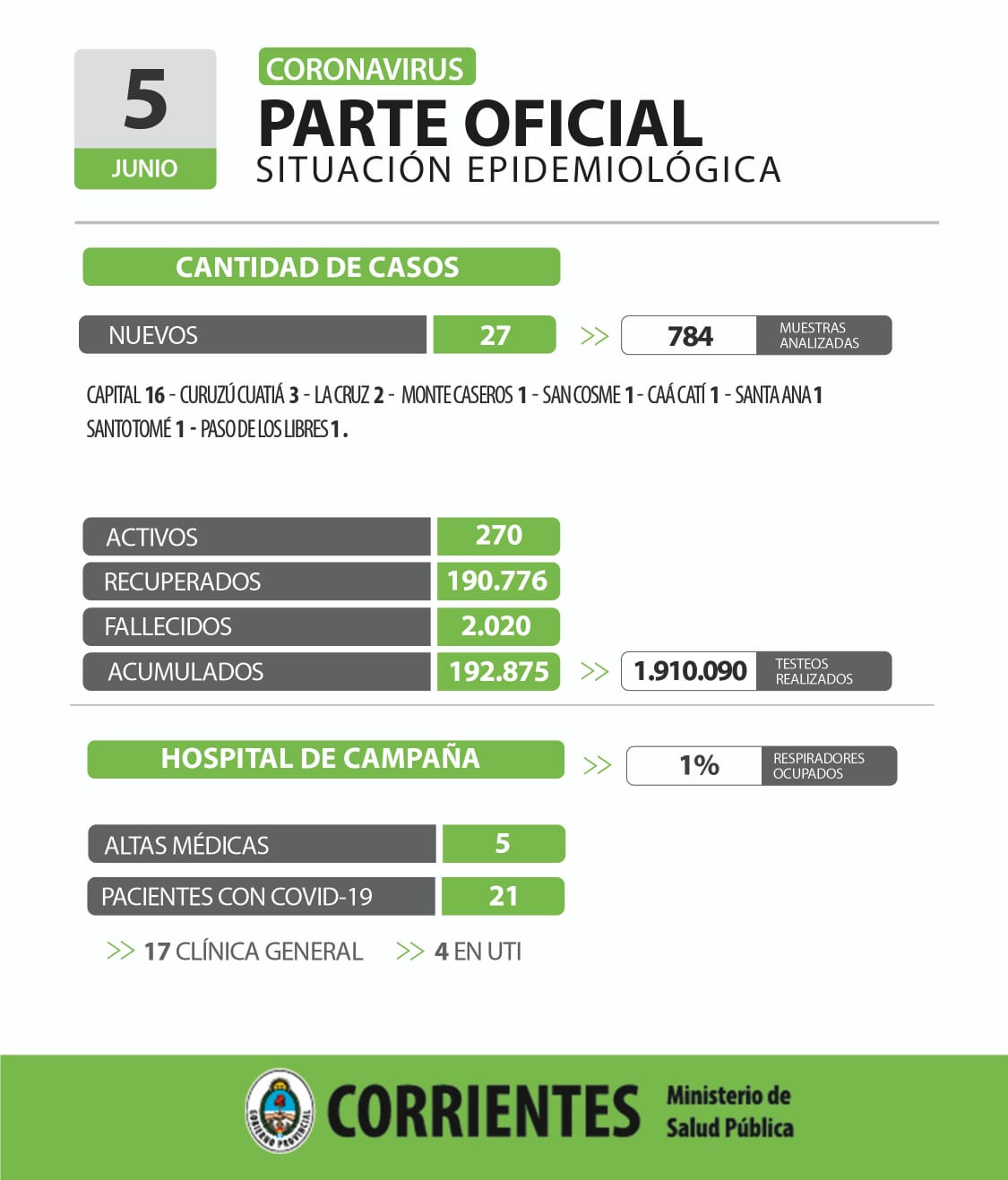 El informe epidemiológico de la provincia de Corrientes registró este domingo 5 de junio, 27 nuevos casos positivos de Coronavirus, de los cuales 16 fueron contagios en la ciudad Capital y los 11 restantes en 8 localidades del interior provincial, al haberse analizado 784 muestras en las últimas 24 horas.