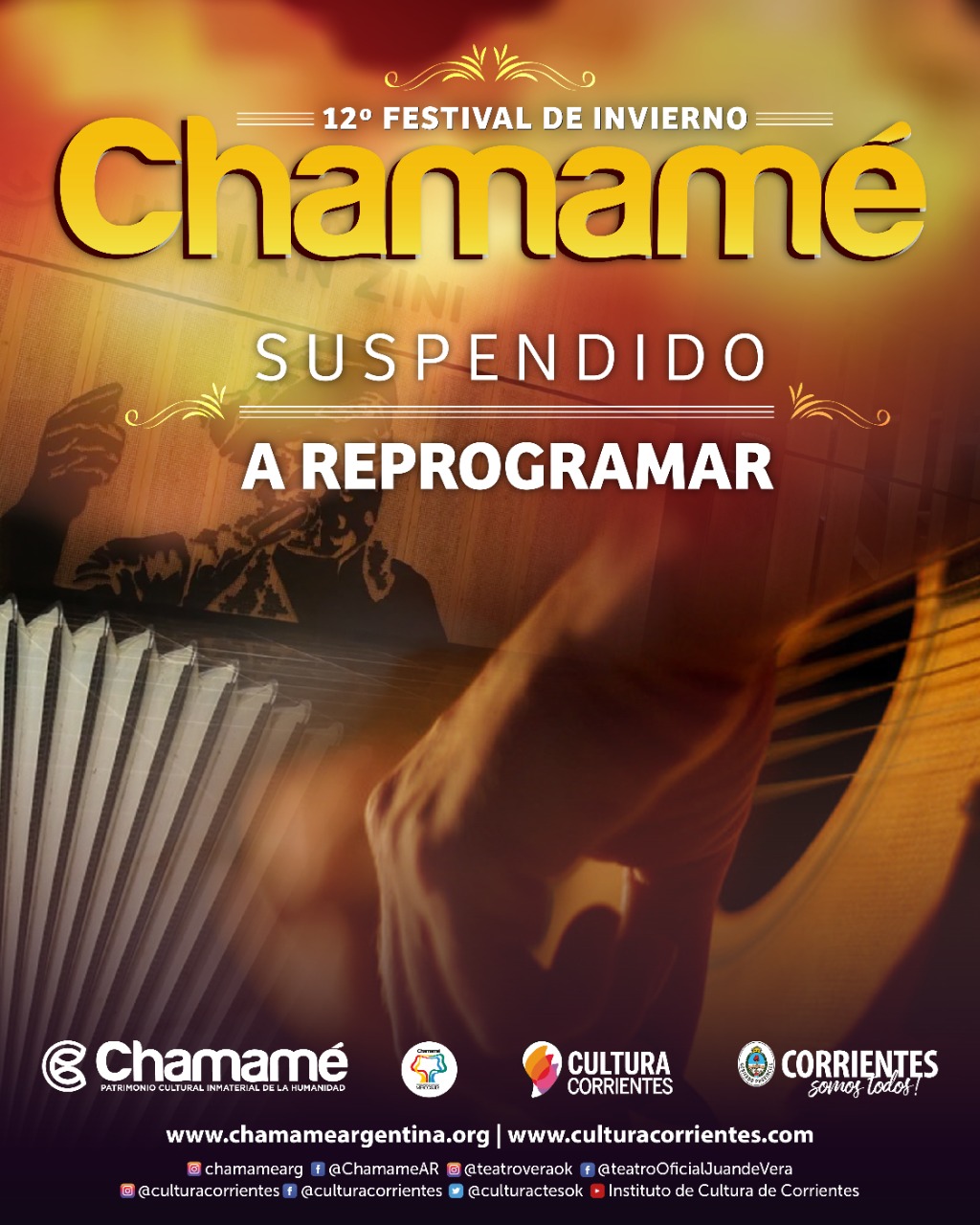 El Festival de Invierno del Chamamé programado en el Auditorio «Julian Zini» se reprogramará para una nueva fecha a comunicar la próxima semana.