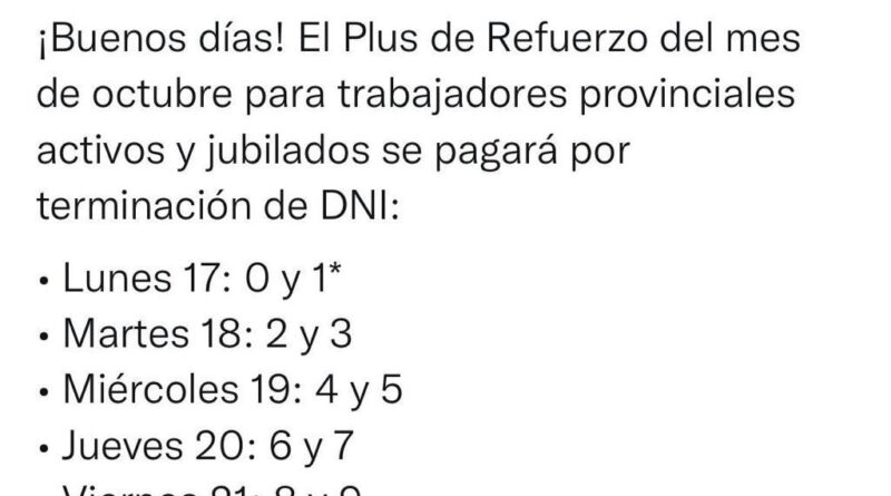 Continúa la liquidación del beneficio el martes 18, para los agentes con DNI terminados en 2 y 3. Mientras que el miércoles 19, percibirán los agentes con documentos finalizados en 4 y 5. El jueves 20, para aquellos con DNI terminados en 6 y 7; y el cronograma termina el viernes 21 con los documentos que finalizan en 8 y 9.