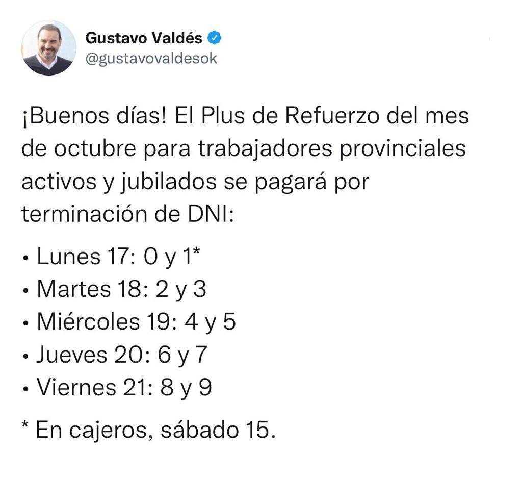 Plus de Refuerzo: Valdés confirma el cronograma de pago de octubre