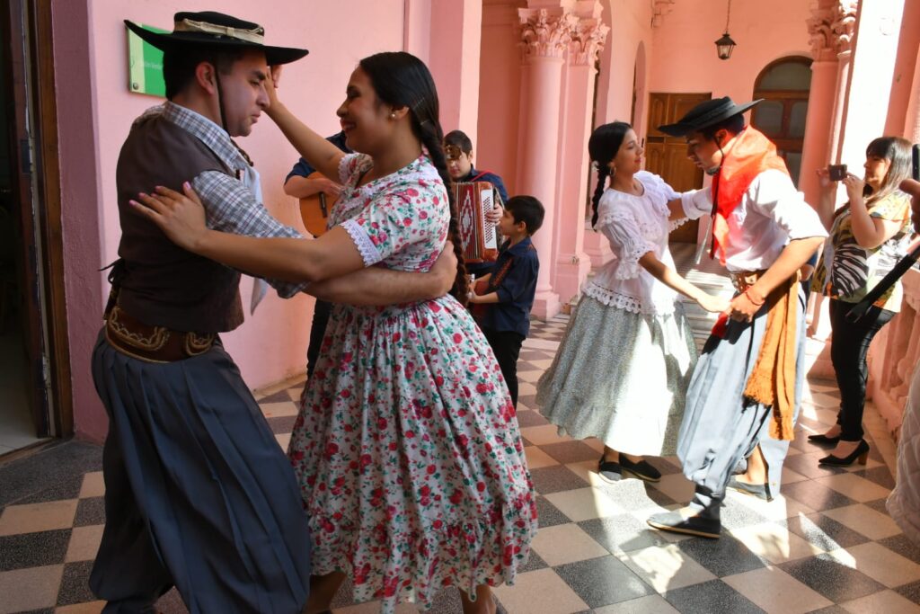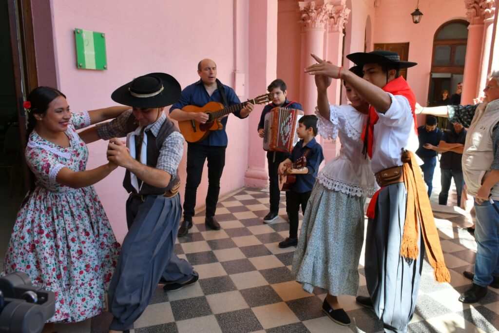 Finalizada la presentación de la Fiesta, en la galería de Casa de Gobierno, representantes de Riachuelo desplegaron una demostración de bailes típicos.