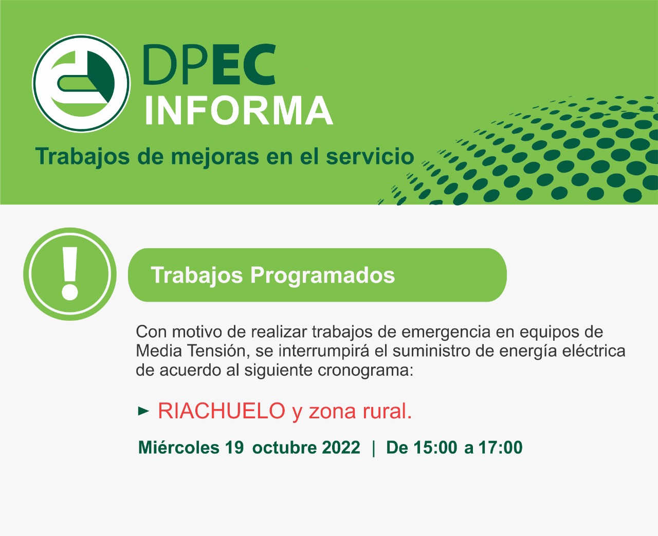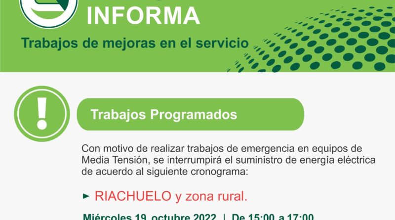 La Dirección Provincial de Energía de Corrientes (DPEC) informa que se realizarán trabajos de emergencia en equipos de Media Tensión, por lo cual se interrumpirá el suministro de energía eléctrica en la localidad de Riachuelo y zona Rural, este miércoles 19 de 15 a 17.