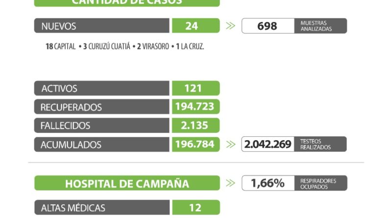 El informe epidemiológico de la provincia de Corrientes registró este viernes 24 nuevos casos positivos de Coronavirus, de los cuales 18 son Capital 6; 3 en Curuzú Cuatiá; 2 en Virasoro; y 1 en La Cruz, al haberse analizado 698 muestras en las últimas 48 horas.