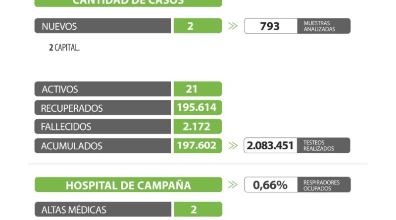 El informe epidemiológico de la provincia de Corrientes registró este viernes 2 nuevos casos positivos de Coronavirus, ambos reportados en Capital, al haberse analizado 793 muestras en las últimas 72 horas.