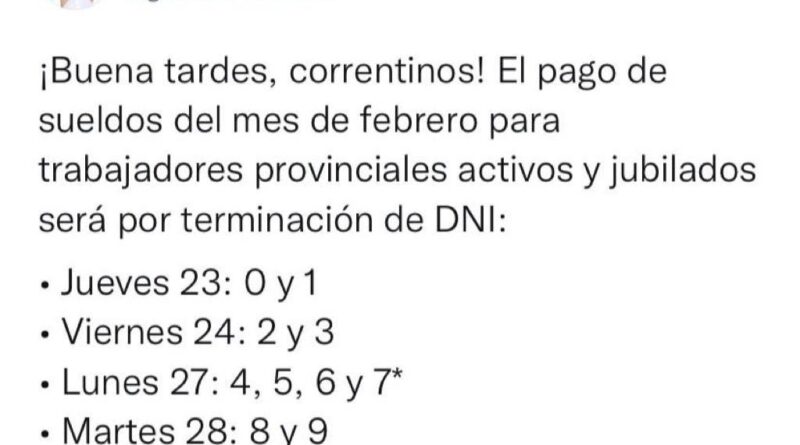 El mandatario provincial comunicó este martes a través de sus redes sociales, @gustavovaldesok, que el pago del sueldo de febrero inicia este jueves 23, fecha que percibirán los agentes con números de Documento Nacional de Identidad terminados en 0 y 1.