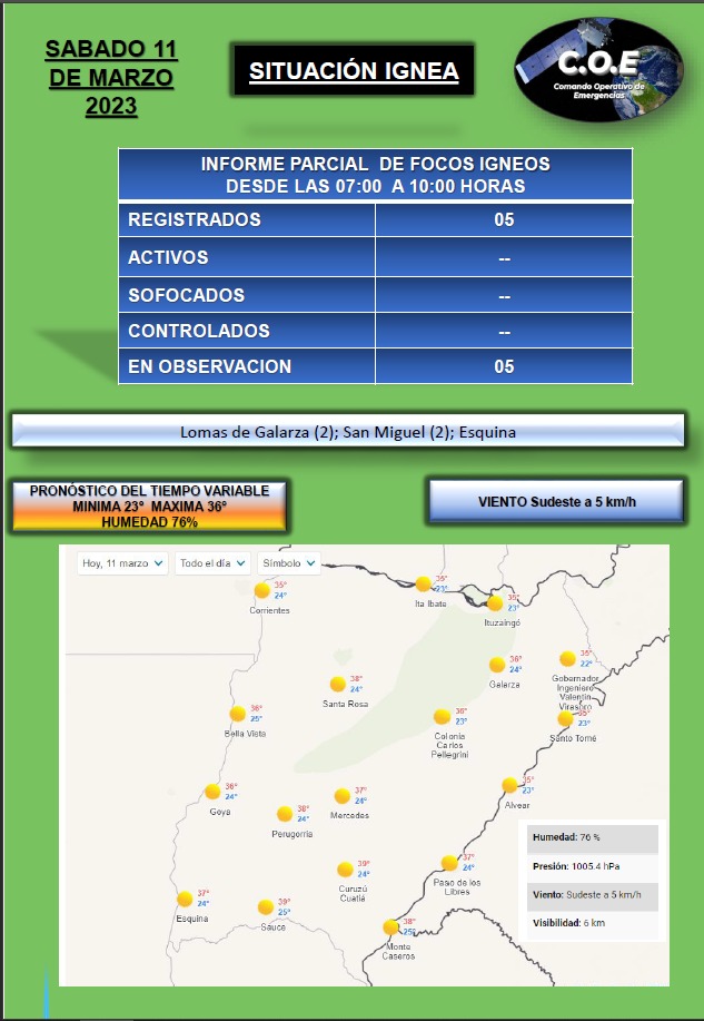 El Comando Operativo de Emergencias (COE) de la provincia de Corrientes informó este sábado 11 de marzo, que en las últimas horas se registraron 5 focos de incendios, los cuales se encuentran en observación.