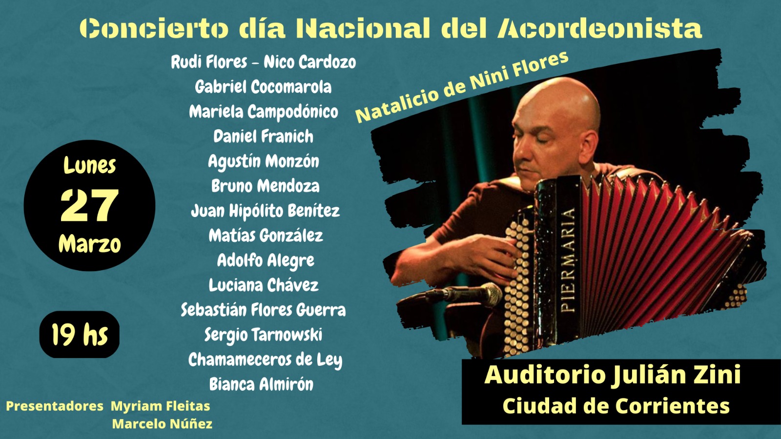 El ministro Secretario General de la Gobernación, doctor Carlos Vignolo invita al Concierto en Homenaje al natalicio de Nini Flores,  en el Día Nacional del  Acordeonista, que tendrá lugar esta tarde en el Auditorio Julián Zini, a partir de las 19 hs.