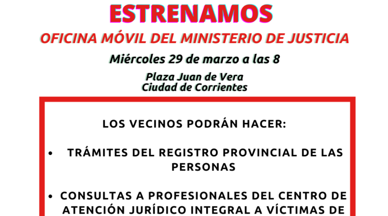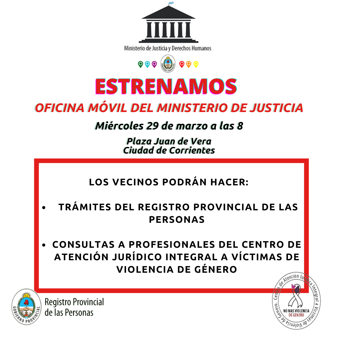 Con el objetivo de llegar a cada rincón de la Provincia, el Ministerio de Justicia y Derechos Humanos pone en marcha su Oficina Móvil, que se estrenará este miércoles desde las 8 en la Plaza «Juan de Vera» de la ciudad de Corrientes.