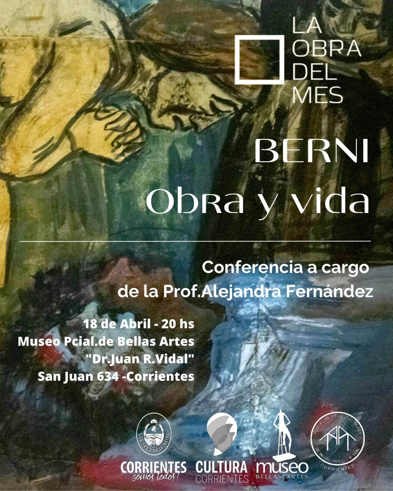 El Instituto de Cultura de Corrientes invita a la conferencia sobre la vida y obra de Antonio Berni, a cargo de la Prof. Alejandra Fernández, que se realizará este martes 18 de abril, a las 20, en el Museo de Bellas Artes “Dr. Juan R. Vidal”, dando inicio al ciclo de “La obra del Mes”. El acceso es libre y gratuito, sujeto a la capacidad de la sala.