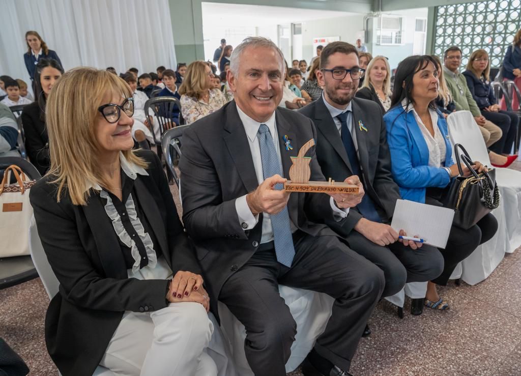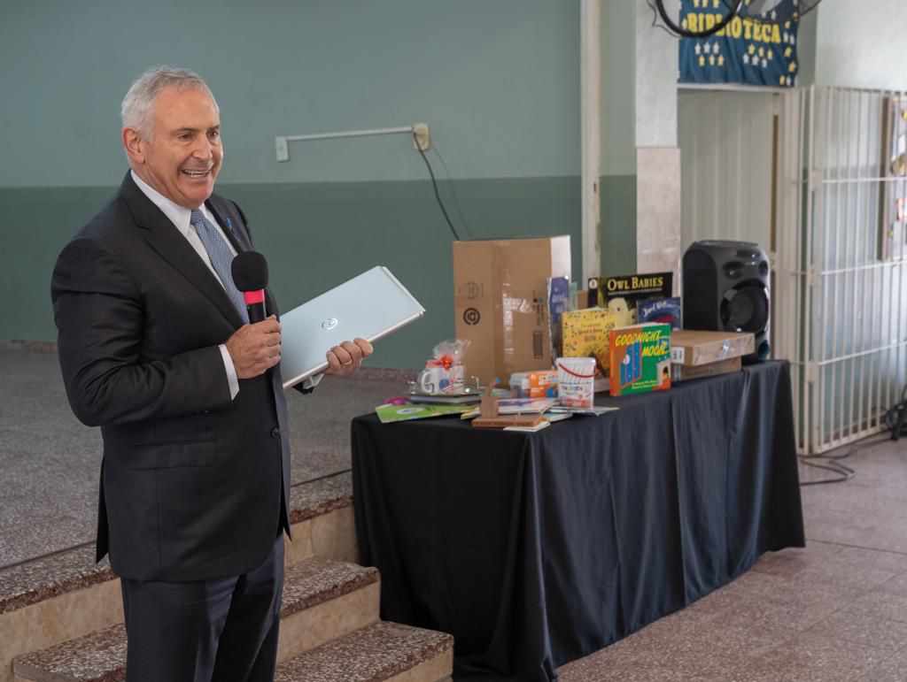 La ministra de Educación, Práxedes López, y el embajador de Estados Unidos en la Argentina, Marc Stanley, visitaron esta mañana la Escuela N.º 404 «Dr. Eduardo Wilde», y entregaron equipamiento, parlantes, laptops, libros de cuento en inglés y sets de arte, en el marco de las celebraciones por el ducentésimo aniversario de las relaciones diplomáticas entre Argentina y Estados Unidos.
