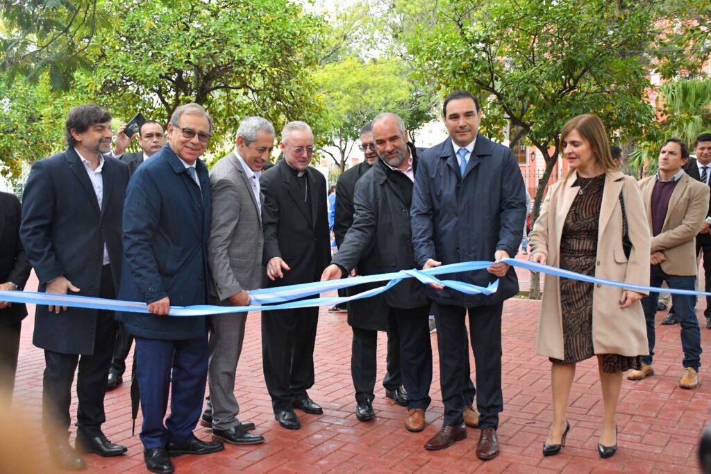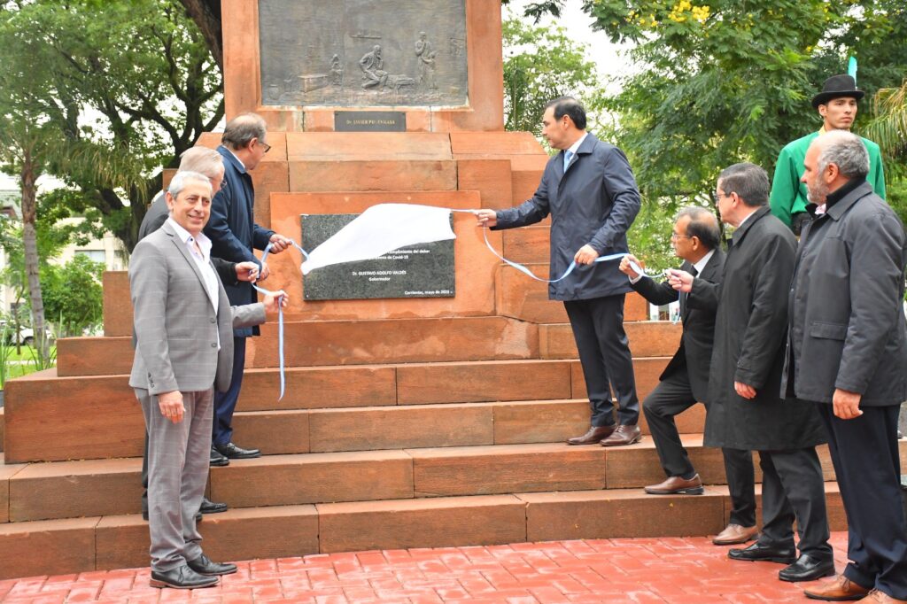 Luego, se trasladaron al centro de la plaza, al pie del monumento del Dr. José Ramón Vidal, donde se procedió al descubrimiento de placa en memoria de los profesionales de la salud fallecidos en la pandemia. También se interpretó el Himno Nacional a cargo de la Banda de Música de la Policía de Corrientes, seguido de la bendición de las obras por Monseñor Stanovnik.