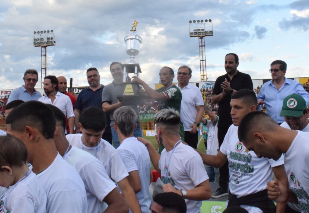 El gobernador Gustavo Valdés entregó el trofeo y las medallas a los finalistas del Torneo Provincial de Fútbol que consagró Campeón al Club Deportivo Mandiyú que venció a San Lorenzo de Monte Caseros, tras el partido que se disputó en la cancha del Club Boca Unidos de Corrientes con estadio lleno.