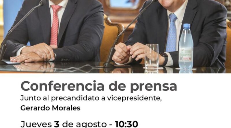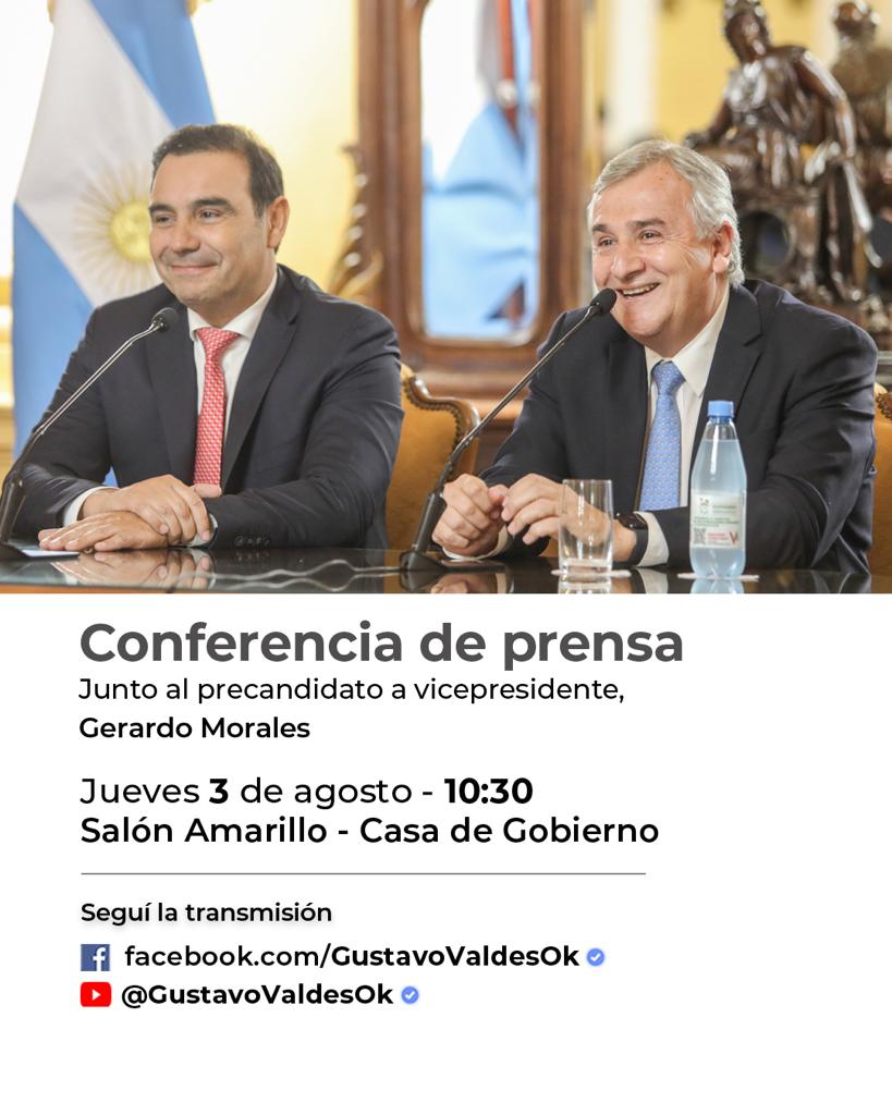 Este jueves el gobernador de Corrientes, Gustavo Valdés recibirá a su par de la provincia de Jujuy  y precandidato a vicepresidente de la Nación, Gerardo Morales y ambos ofrecerán una conferencia de prensa a las 10,30 en el Salón Amarillo de Casa de Gobierno. Luego, a las 12 el mandatario jujeño mantendrá una reunión con sectores productivos y empresariales en la sede de FECORR, ubicada en 25 de Mayo 761 de la ciudad Capital y culminada la misma, emprenderá con Valdés un viaje hasta la localidad de Santa Rosa para recorrer el Parque Forestoindustrial.