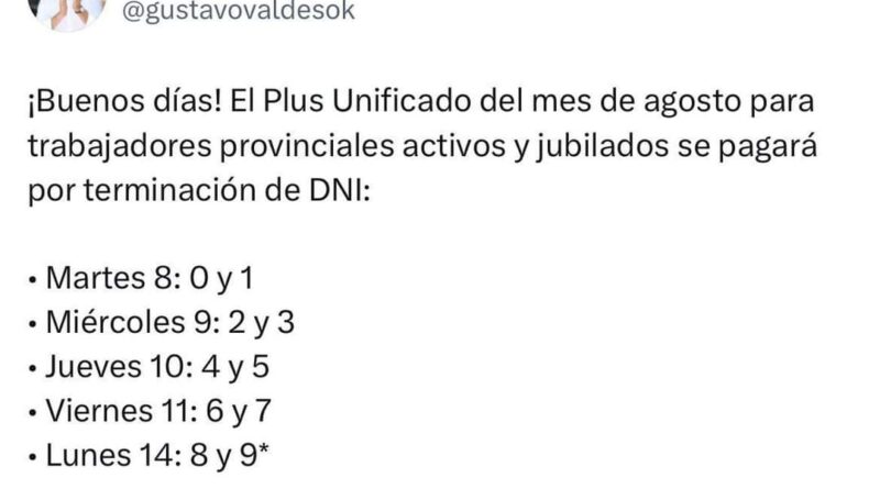A través de sus redes sociales, @gustavovaldesok, el gobernador Gustavo Valdés anunció el cronograma del Adicional Remunerativo Mensual de $27.650 por agente de agosto, a partir de este martes 8. La liquidación terminal el lunes 14, para los activos, jubilados y pensionados provinciales.