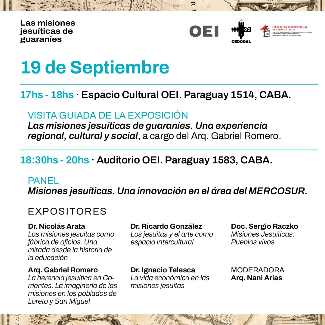 El encuentro continuará el 19 de septiembre, a las 17, con una visita guiada de la exposición a cargo del presidente del Instituto de Cultura, Gabriel Romero. En tanto, a las 18.30 horas, en el auditorio de la OEI, está previsto el panel «Misiones Jesuíticas. Una innovación en el área del MERCOSUR», con los siguientes expositores: Dr. Nicolás Arata, Dr. Ricardo González, Doc. Sergio Raczko, Arq. Gabriel Romero, y Dr. Ignacio Telesca; con la moderación a cargo de la Arq. Nani Arias.