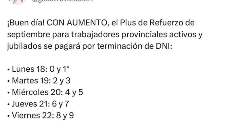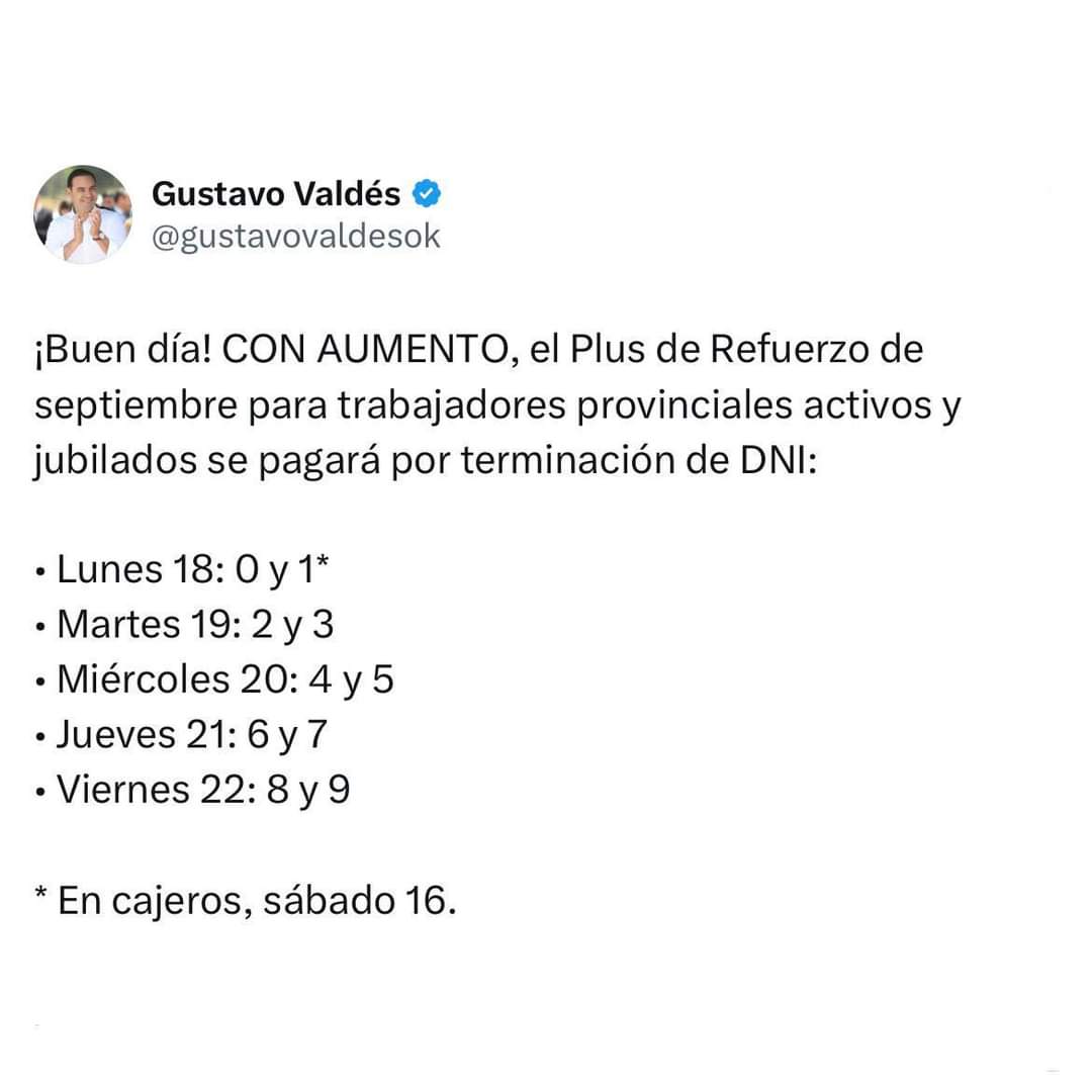 A través de sus redes sociales, el Mandatario correntino anunció que el pago del Plus de Refuerzo de septiembre, que con un aumento de $10.000, pasó de $15.000 a $25.000, entre este lunes 18 y el viernes 22.