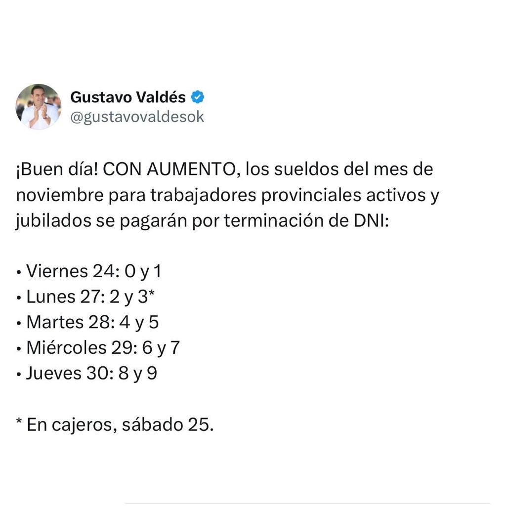A través de sus redes sociales, el gobernador Gustavo Valdés anunció esta mañana, el cronograma de sueldos con aumento, correspondiente al mes en curso, para trabajadores activos y jubilados.