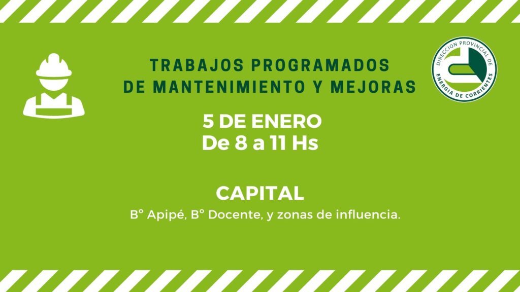 Por otra parte, la DPEC realizará tareas de mantenimiento de LMT en la Capital provincial, generando la interrupción del servicio de energía de 8 a 11 horas, en el área comprendida por los barrios Apipé, Docente y zonas de influencia.
