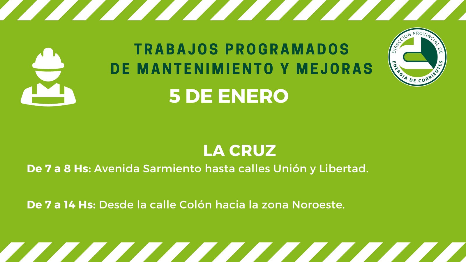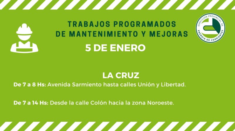 De esta manera y con el fin de ejecutar tareas de mantenimiento de Líneas de Media Tensión (LMT) y puesta en servicio de una nueva subestación eléctrica (SET), por lo cual se cortará la luz momentaneamente en La Cruz. En el horario de 7 a 8, en la zona de la avenida Sarmiento hasta calles Unión y Libertad; mientras que de 7 a 14 horas afectará desde calle Colón hacia la zona noroeste.