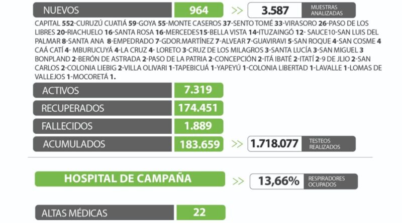 Leer másEl informe epidemiológico de la provincia de Corrientes registró este miércoles 964 nuevos casos positivos de Coronavirus, de los cuales